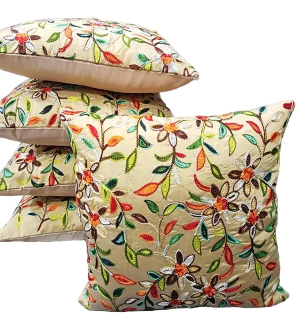 Beige Kashmiri Floral Embroidered Silk Cushion Covers 16×16 Inches or 40×40 cm(Set of 5)