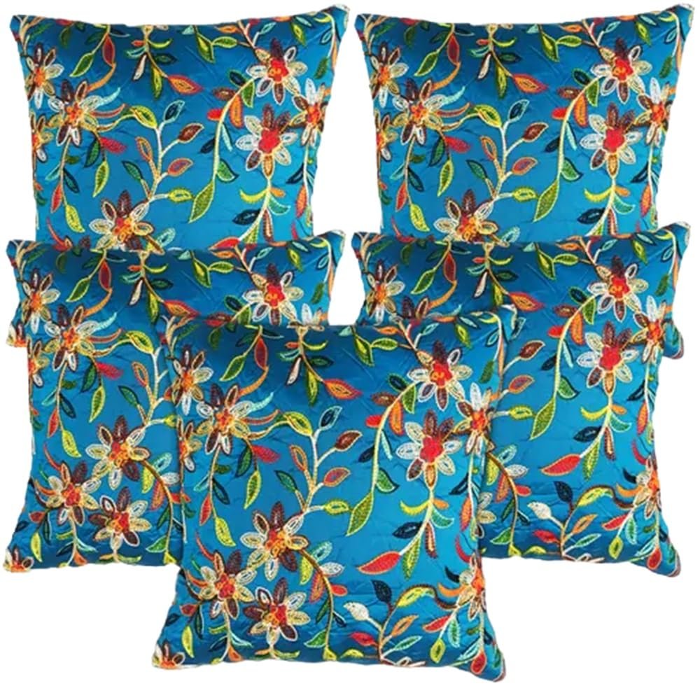 Blue Kashmiri Floral Embroidered Silk Cushion Covers 16×16 Inches or 40×40 cm(Set of 5)