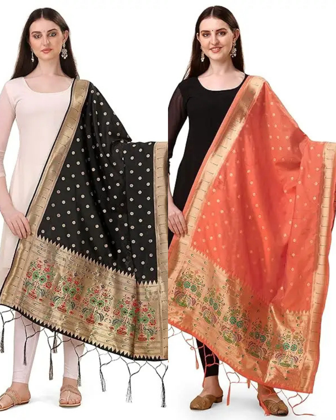 Elegant Black-Peach Combo Banarasi Paithani Silk Dupatta / Chunni for Women
