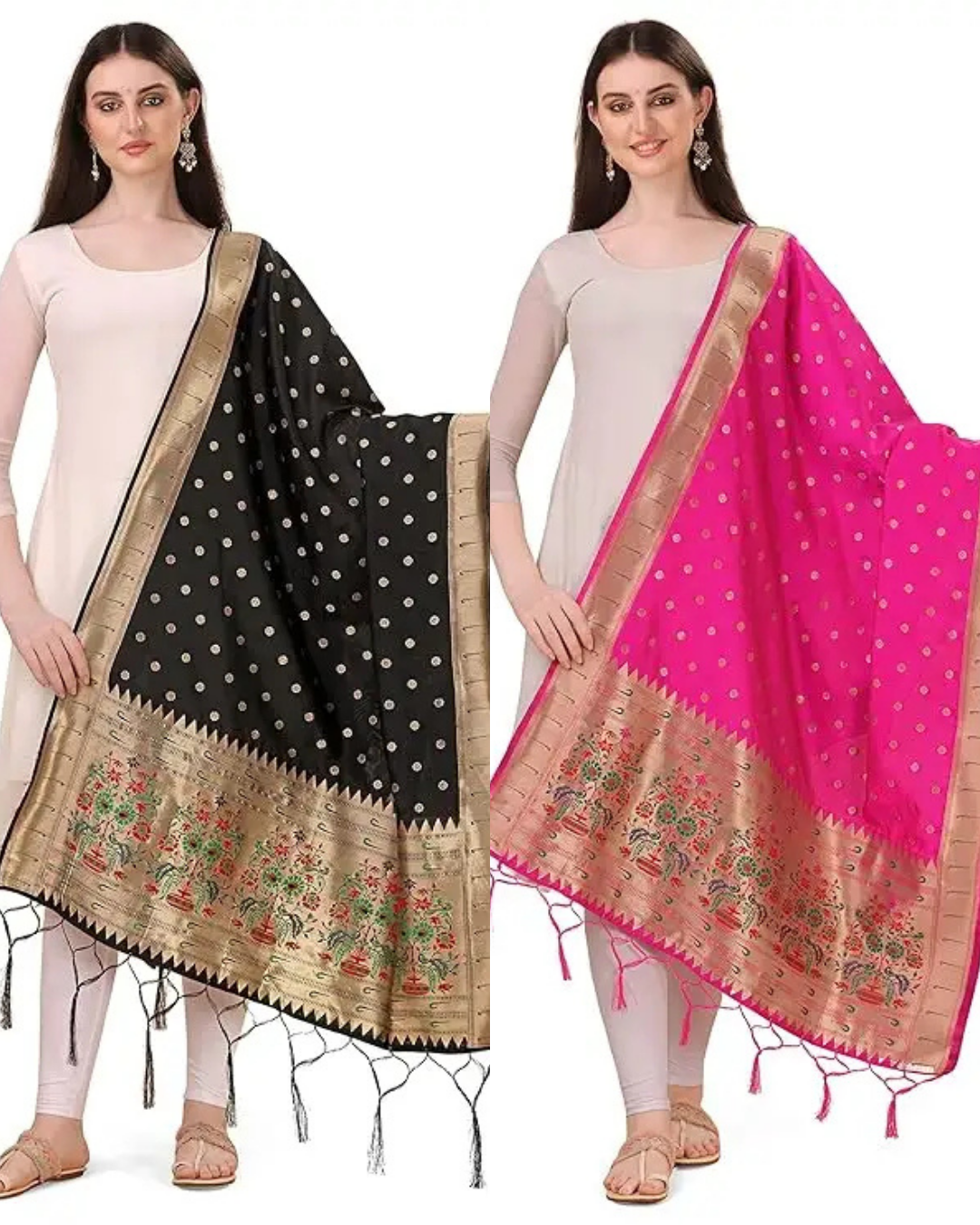 Elegant Black-Rani pink Combo Banarasi Silk Paithani Dupatta / Chunni for Women