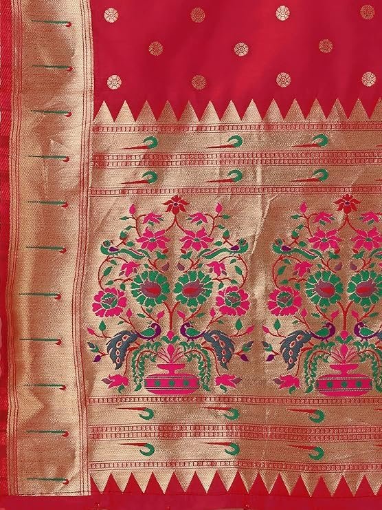 Add the Banarasi silk orange Paithani dupatta to your ensemble for a graceful look. Pair it with a simple kurta or even a chic dress to transform your ensemble, leaving a lasting impression wherever you go.