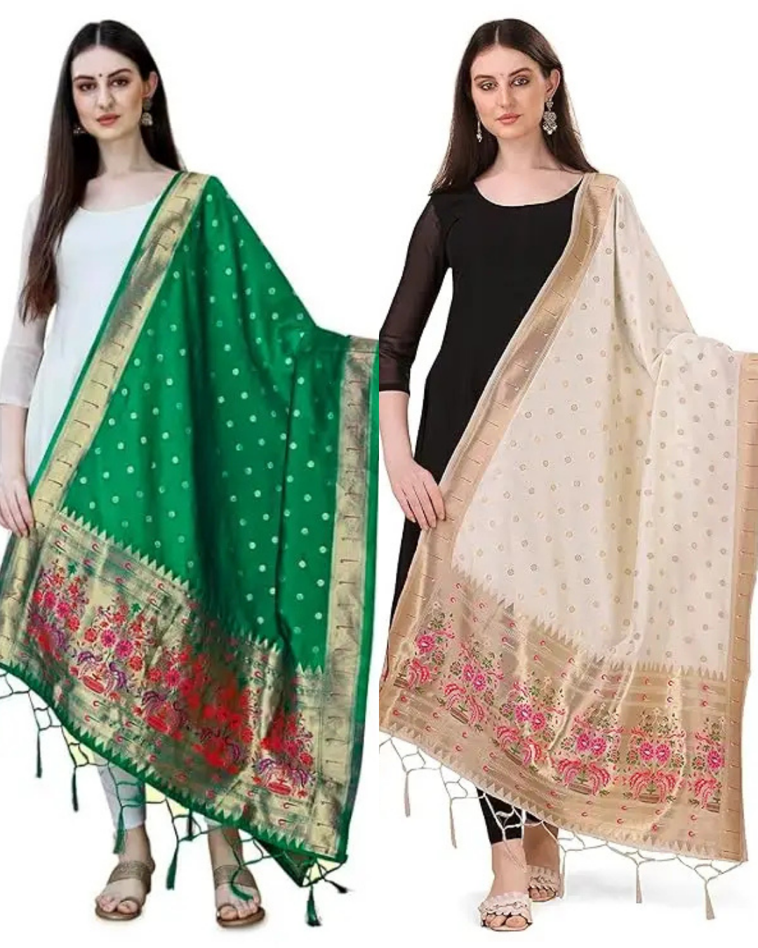 Elegant Parrot Green-White Combo Banarasi Paithani Silk Dupatta / Chunni for Women