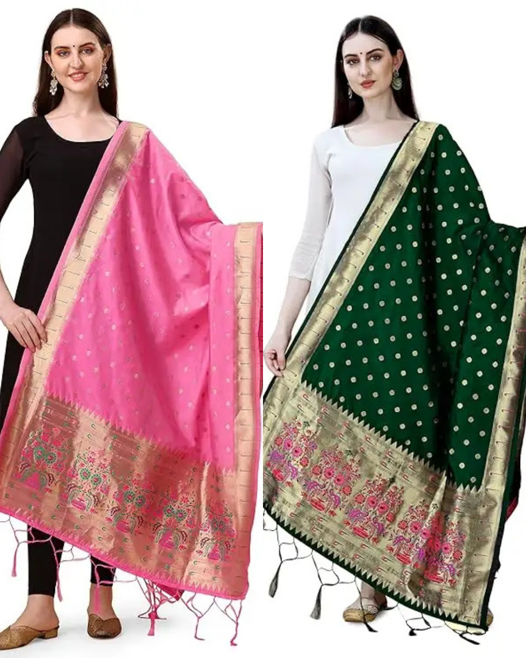 Fancy Baby Pink-Dark Green Banarasi Silk Dupatta Combo / Chunni for Women