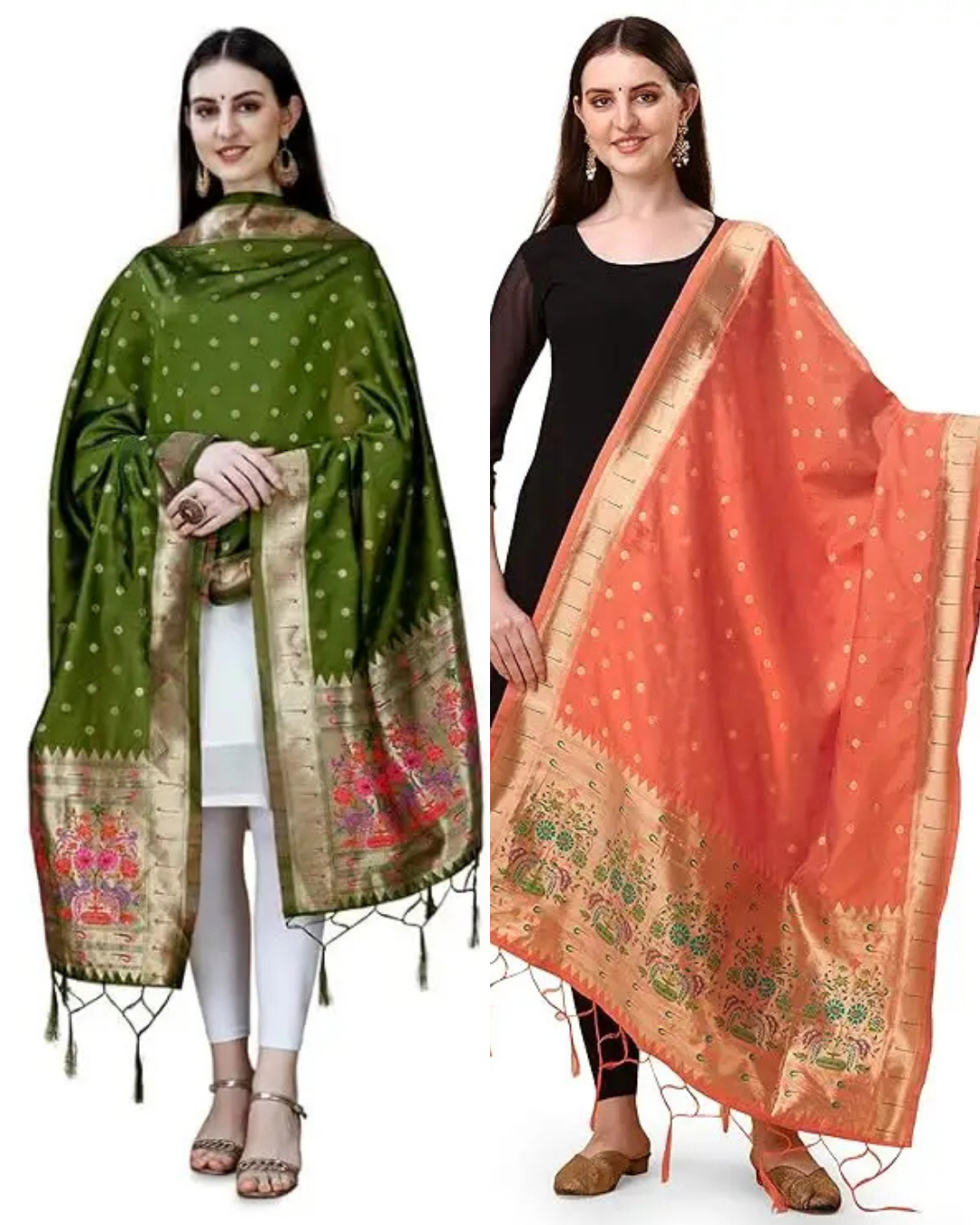 Fancy Mehendi Green-Peach Banarasi Silk Dupatta Combo / Chunni for Women