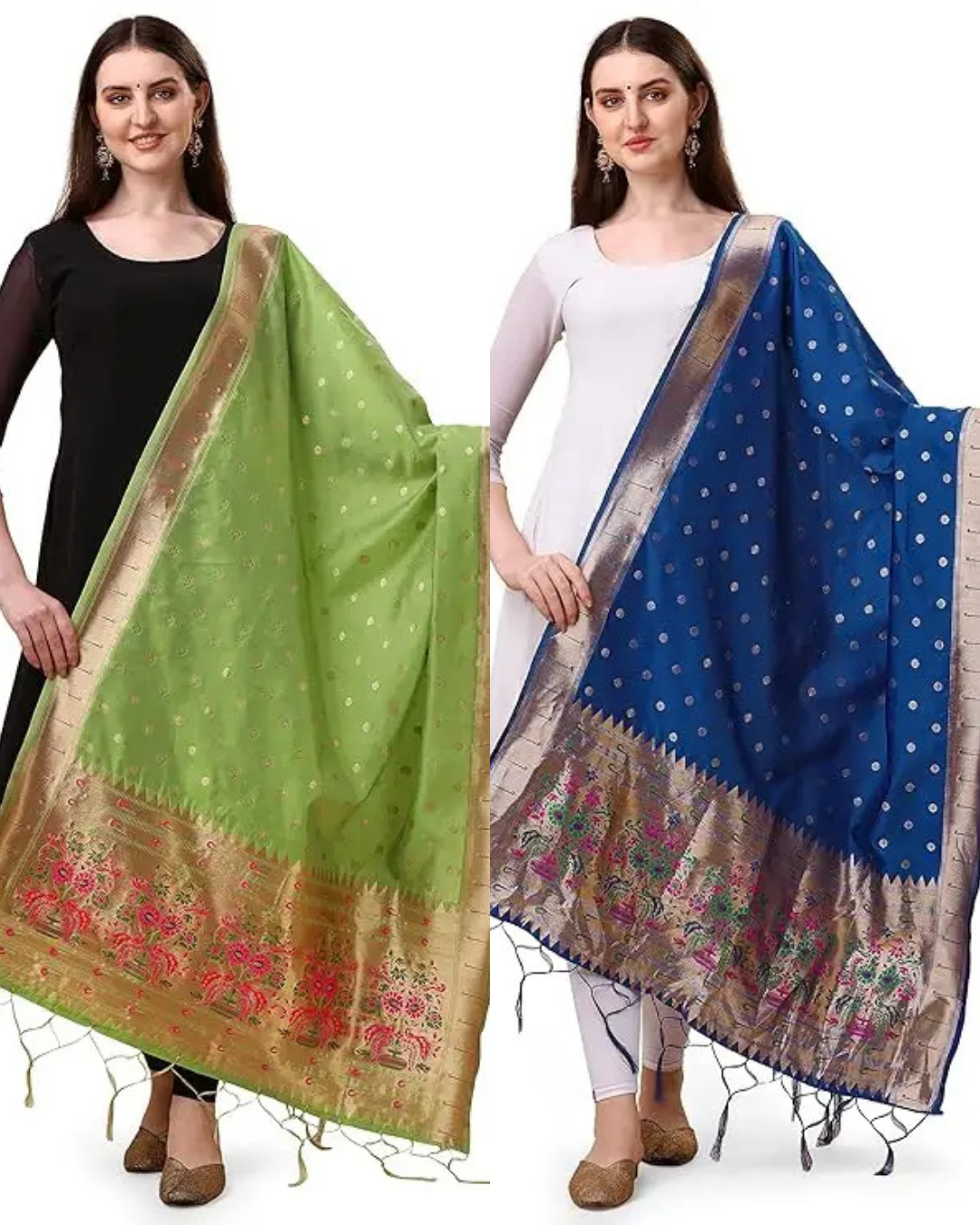 Fancy Pista Green and Navy Blue Banarasi Silk Dupatta Combo / Chunni for Women