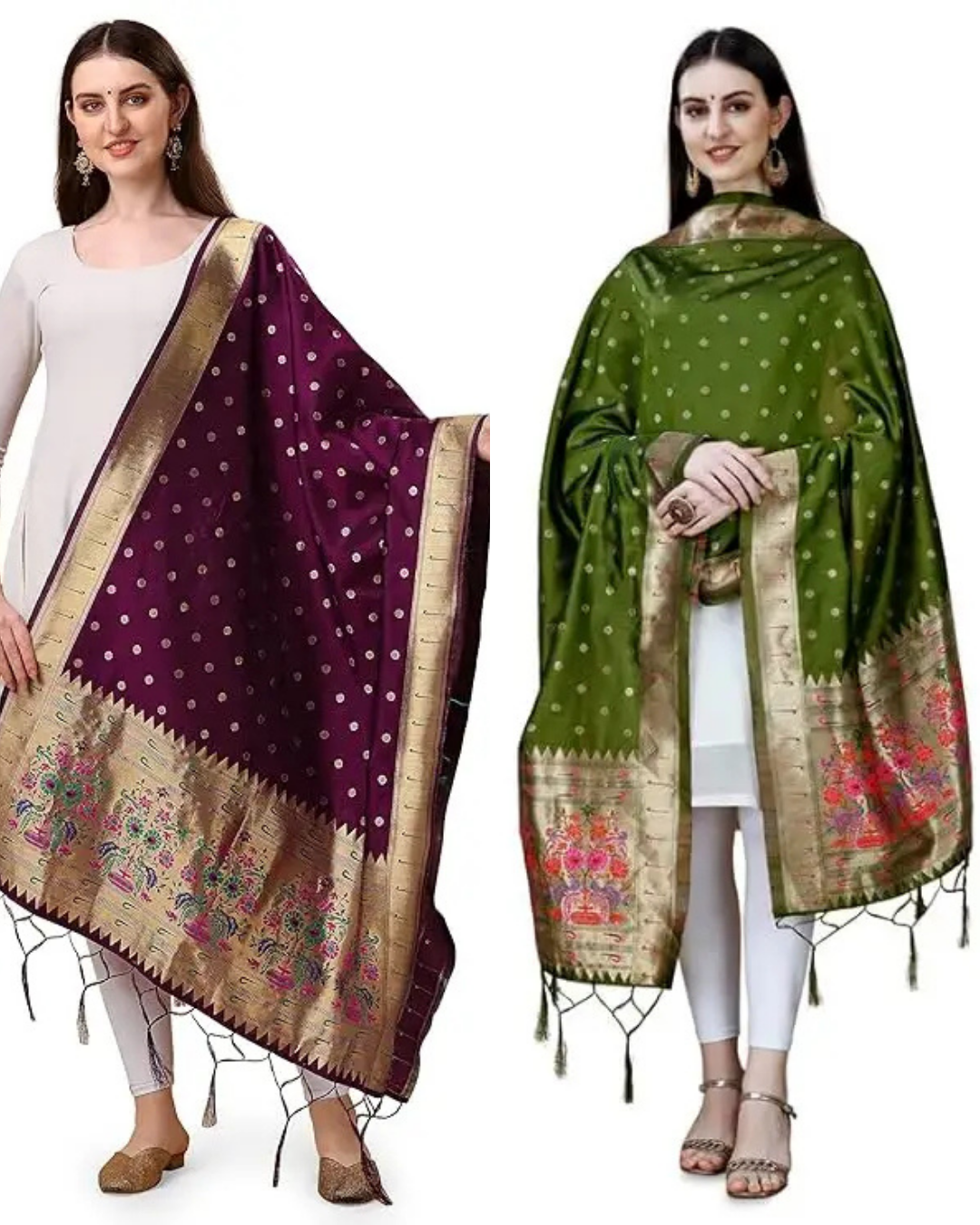 Fancy Wine-Mehendi Green Banarasi Silk Dupatta Combo / Chunni for Women