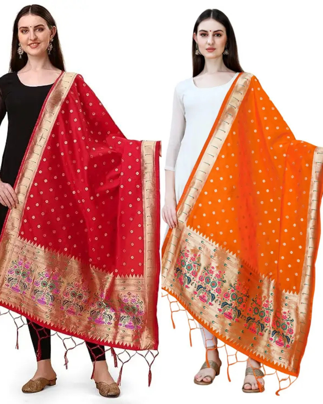 Traditional Red and Orange Banarasi Silk Dupatta Combo