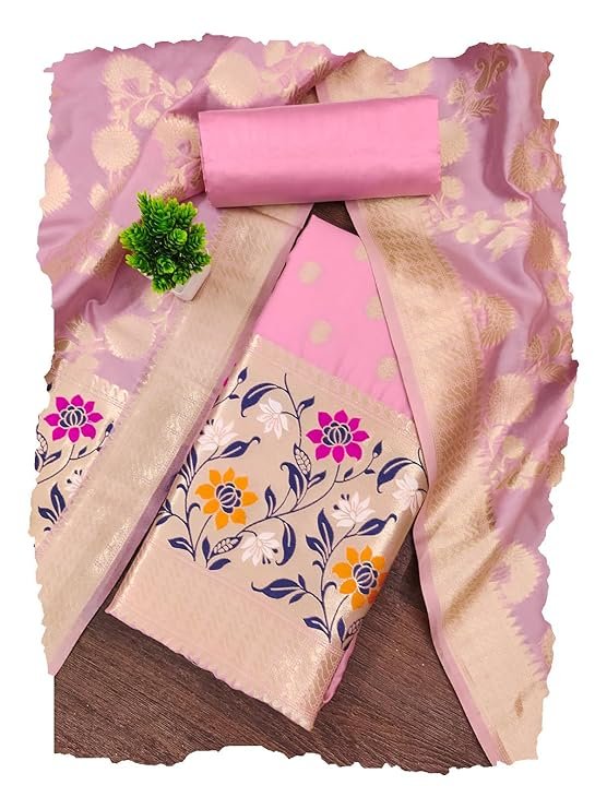 Unstitched Women’s Banarasi Cotton Salwar Suit Dress Material in Baby Pink Color With Cotton Silk Dupatta