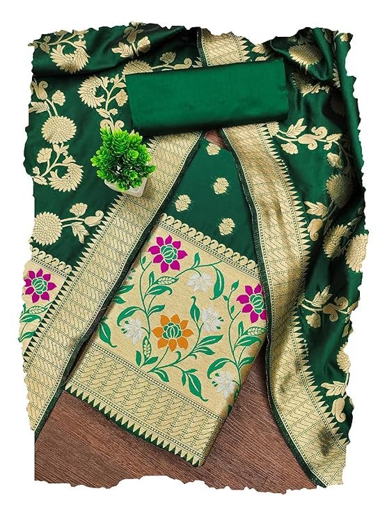 Unstitched Women’s Banarasi Cotton Salwar Suit Dress Material in Dark Green Color With Cotton Silk Dupatta